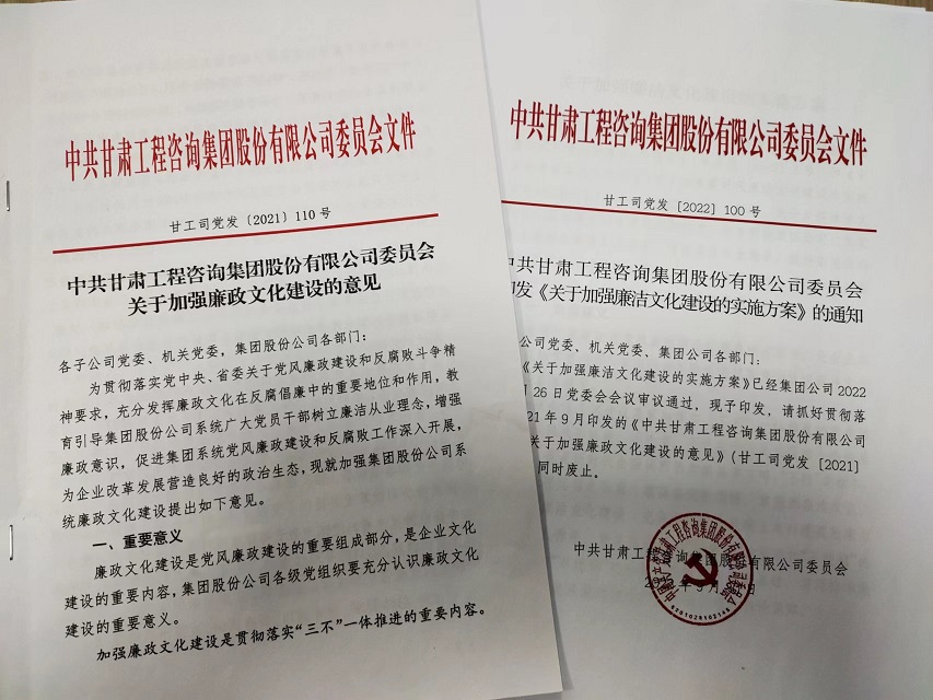 作為新組建的產(chǎn)業(yè)集團(tuán),甘肅工程咨詢集團(tuán)把資產(chǎn)整合、產(chǎn)業(yè)耦合和文化融合作為集團(tuán)公司組建的重要內(nèi)容,其中讓廉潔文化建設(shè)在企業(yè)文化建設(shè)中先行一步,早安排早部署,2021年9月集團(tuán)公司黨委研究印發(fā)《關(guān)于加強(qiáng)廉政文化建設(shè)的意見》,在中共中央辦公廳《關(guān)于加強(qiáng)新時(shí)代廉潔文化建設(shè)的意見》和省委《實(shí)施方案》印發(fā)后,又及時(shí)對(duì)標(biāo)、查缺補(bǔ)漏,2022年9月修訂印發(fā)《關(guān)于加強(qiáng)廉潔文化建設(shè)的實(shí)施方案》,為新時(shí)代集團(tuán)公司加強(qiáng)廉潔文化建設(shè)提供了指導(dǎo)。自組建以來(lái),集團(tuán)公司廉潔文化建設(shè)力求在“內(nèi)化于心”上下功夫,在“外化于行”上求實(shí)效,引導(dǎo)干部職工廉潔從業(yè),廉潔用權(quán),積極營(yíng)造“崇廉、尚廉、倡廉、守廉”的企業(yè)風(fēng)尚和發(fā)展氛圍。