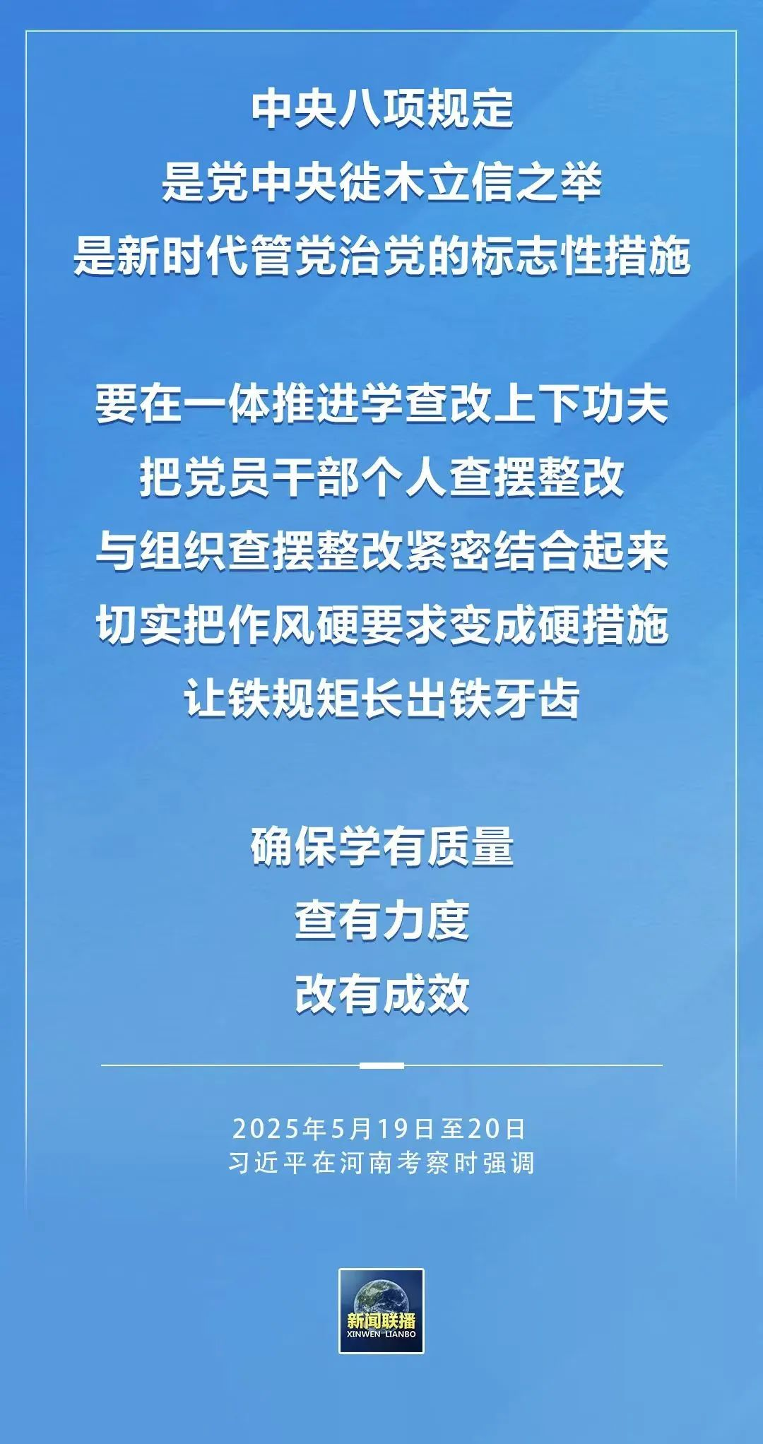 習(xí)近平總書(shū)記在河南考察時(shí)對(duì)深入貫徹中央八項(xiàng)規(guī)定精神學(xué)習(xí)教育提出明確要求,強(qiáng)調(diào)“要在一體推進(jìn)學(xué)查改上下功夫”“確保學(xué)有質(zhì)量、查有力度、改有成效”。