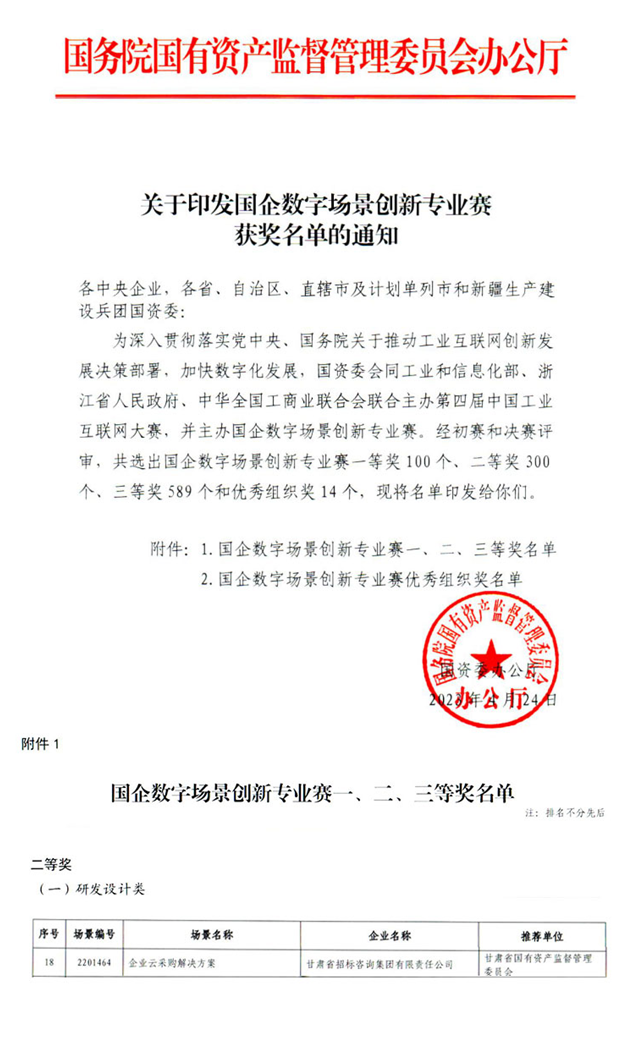 近日,國務院國資委公布了首屆“國企數(shù)字場景創(chuàng)新專業(yè)賽”獲獎名單。甘肅工程咨詢集團組織推薦的“甘招企業(yè)云采購平臺”創(chuàng)新場景,在全國2007家參賽企業(yè)推薦的3277個場景中脫穎而出,榮獲二等獎!