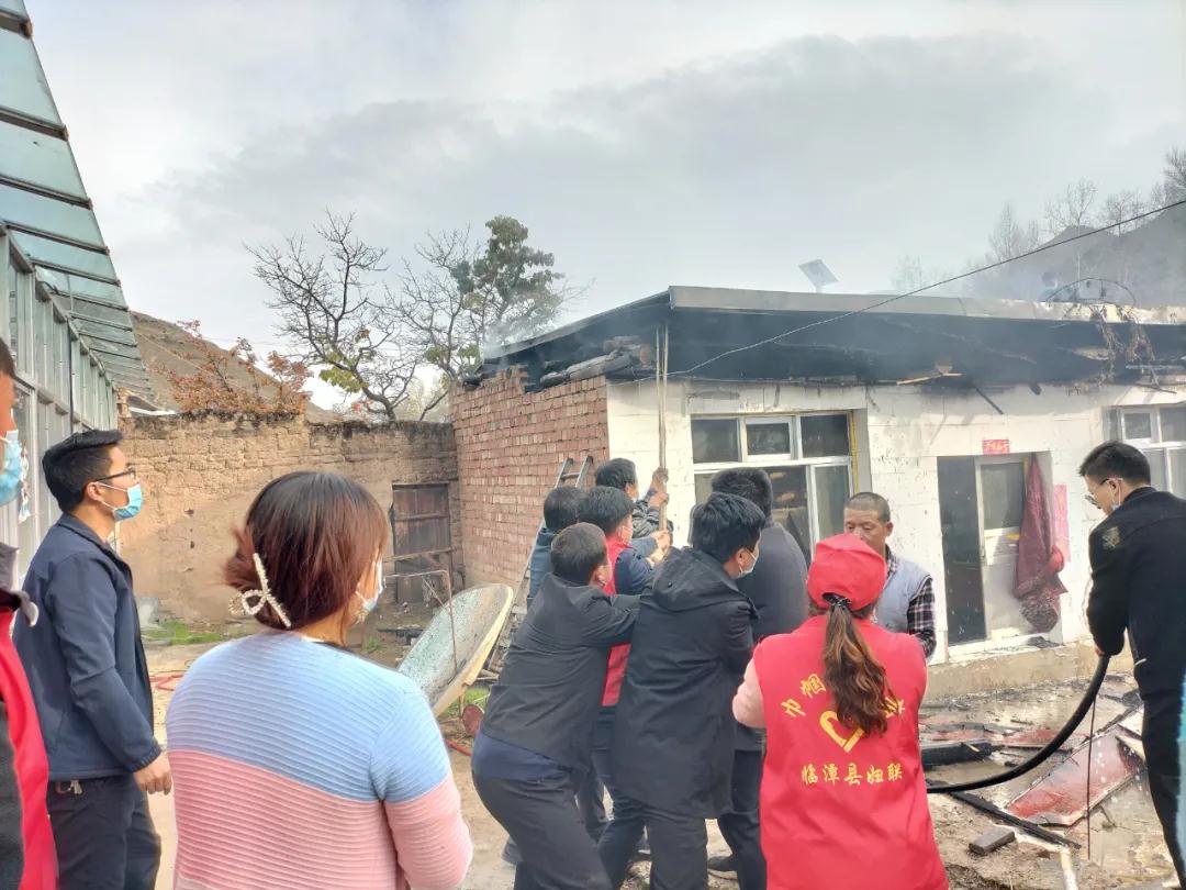 聽到村民們的呼救聲,正在村口疫情防控監(jiān)測點值守的幫扶工作隊隊員、包村干部與鎮(zhèn)領(lǐng)導(dǎo)、村“兩委”干部及志愿者一起,第一時間沖向了火災(zāi)現(xiàn)場,實施開展撲救工作。現(xiàn)場火勢兇猛,盡管眾人一起用水傾澆,卻仍未阻止火勢蔓延。瞬間,屋頂?shù)臋M梁也燒著了,發(fā)出噼啪的響聲,房頂隱約在搖晃,可大家依然奮不顧身地救火,甚至有人沖上了危險的屋頂。