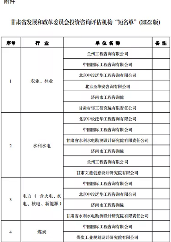 近日,省發(fā)改委公布2022年進入省發(fā)改委投資咨詢評估機構(gòu)企業(yè)名單,甘肅省水利水電勘測設(shè)計研究院有限責(zé)任公司成功入圍三個行業(yè)板塊。