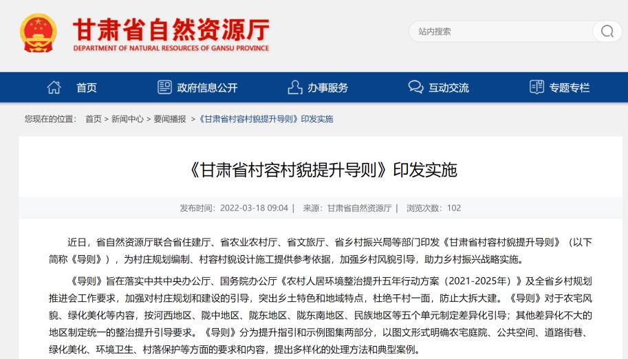 為進(jìn)一步貫徹落實(shí)中共中央辦公廳、國(guó)務(wù)院辦公廳《農(nóng)村人居環(huán)境整治提升五年行動(dòng)方案(2021—2025年)》及全省鄉(xiāng)村規(guī)劃推進(jìn)會(huì)精神,由甘肅省城鄉(xiāng)規(guī)劃設(shè)計(jì)研究院有限公司牽頭,聯(lián)合甘肅省建筑設(shè)計(jì)研究院有限公司、西北師范大學(xué)城市規(guī)劃與旅游景觀設(shè)計(jì)研究院編制的《甘肅省村容村貌提升導(dǎo)則(試行)》(以下簡(jiǎn)稱《導(dǎo)則》),于3月18日由省自然資源廳、省住建廳、省農(nóng)業(yè)農(nóng)村廳、省文旅廳、省鄉(xiāng)村振興局等五部門聯(lián)合印發(fā)?!秾?dǎo)則》的發(fā)布為全省村莊規(guī)劃編制工作提供了參考依據(jù),是推進(jìn)鄉(xiāng)村振興戰(zhàn)略實(shí)施的重要抓手,是改善我省農(nóng)村人居環(huán)境、建設(shè)美麗甘肅的核心引導(dǎo),將在規(guī)范我省村容村貌提升、弘揚(yáng)傳統(tǒng)文化、突出鄉(xiāng)土特色和地域特點(diǎn),杜絕千村一面,防止大拆大建等方面發(fā)揮重要作用。