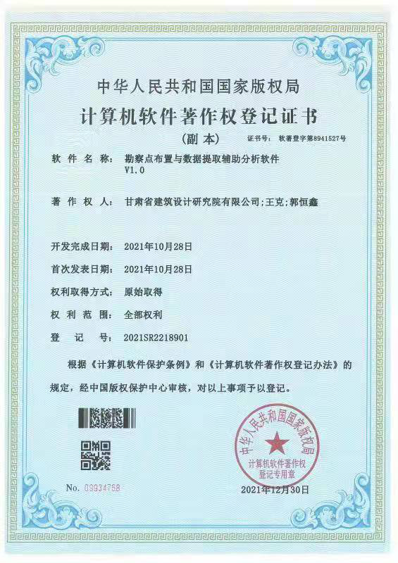 近日,從國家版權局傳來好消息,根據(jù)《計算機軟件保護條例》《計算機軟件著作權登記辦法》規(guī)定,甘肅省建筑設計研究院有限公司工程勘察院研發(fā)的“勘察點布置與數(shù)據(jù)提取輔助分析軟件”,經專家審核,授予計算機軟件著作權登記證書。