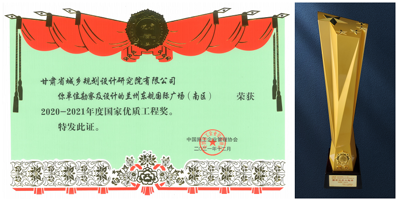 甘肅省城鄉(xiāng)規(guī)劃設(shè)計研究院勘察、設(shè)計的“蘭州東航國際廣場(南區(qū))項目”榮獲“2020—2021年度國家優(yōu)質(zhì)工程獎”。此前,該項目已榮獲2020年工程建設(shè)項目綠色建造設(shè)計水平評價三等成果、2020年度甘肅省優(yōu)秀工程勘察設(shè)計三等獎等多項榮譽。