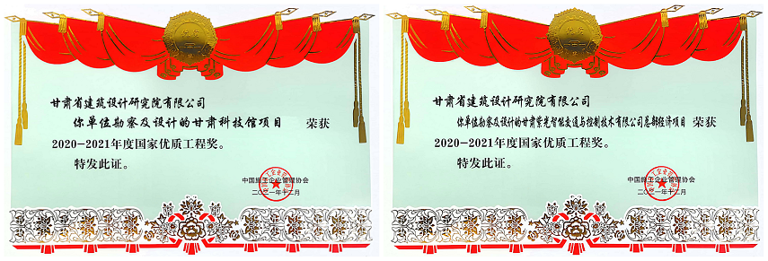 日前,從中國施工企業(yè)管理協(xié)會傳來喜訊,由甘肅省建筑設(shè)計研究院有限公司勘察及設(shè)計的“甘肅科技館項目”和“甘肅紫光智能交通與控制技術(shù)有限公司總部經(jīng)濟項目”榮獲2020—2021年度國家優(yōu)質(zhì)工程獎。