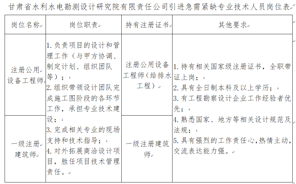 本次引進(jìn)的具體崗位及資格條件詳見《甘肅省水利水電勘測設(shè)計(jì)研究院有限責(zé)任公司引進(jìn)急需緊缺專業(yè)技術(shù)人員崗位表》(附件1)。