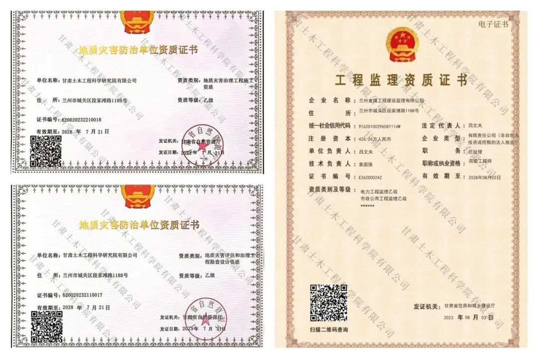 近期,土木工程院申報的地質(zhì)災(zāi)害評估和治理工程勘查設(shè)計乙級、地質(zhì)災(zāi)害治理工程施工乙級兩項資質(zhì)獲省自然資源廳批準(zhǔn)。土木工程院全資子公司蘭州金建工程建設(shè)監(jiān)理有限公司申報的電力工程監(jiān)理乙級資質(zhì)也順利通過省住房和城鄉(xiāng)建設(shè)廳審批。