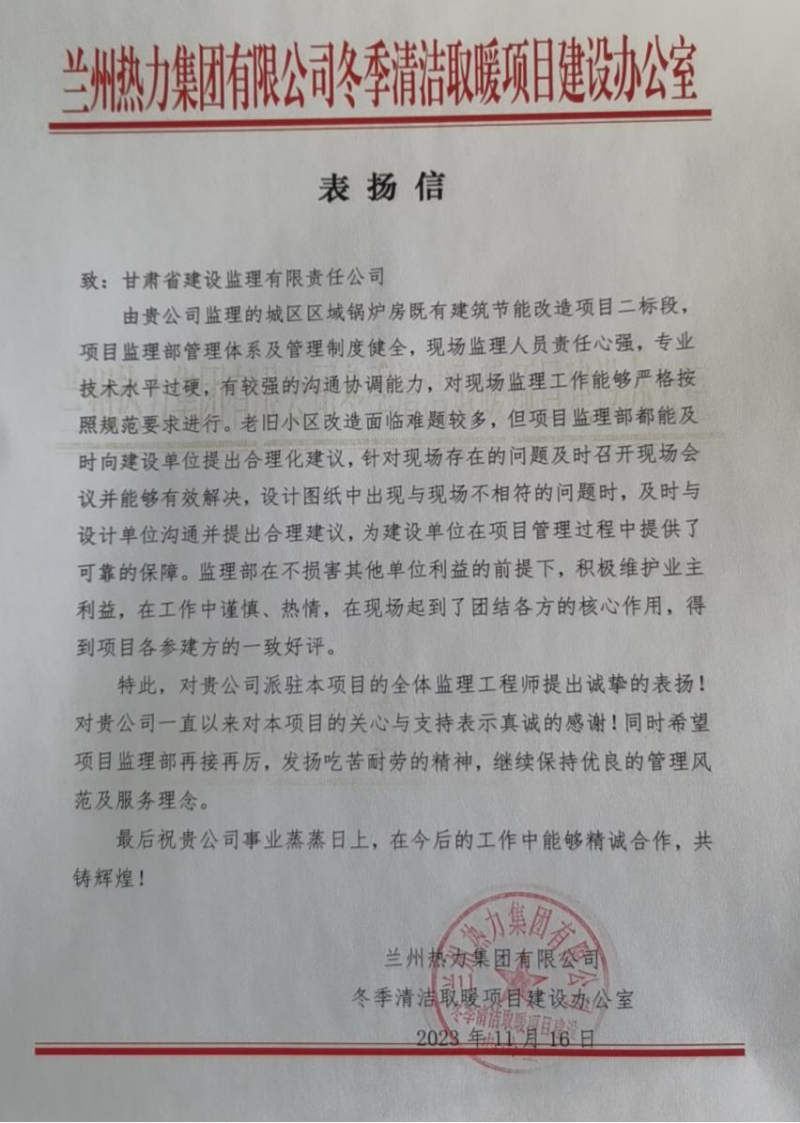 近日,省建設(shè)監(jiān)理公司收到蘭州熱力集團(tuán)有限公司冬季清潔取暖項目建設(shè)辦公室發(fā)來的表揚信,對省建設(shè)監(jiān)理公司城區(qū)區(qū)域鍋爐房既有建筑節(jié)能改造項目二標(biāo)段監(jiān)理部全體人員表示感謝。