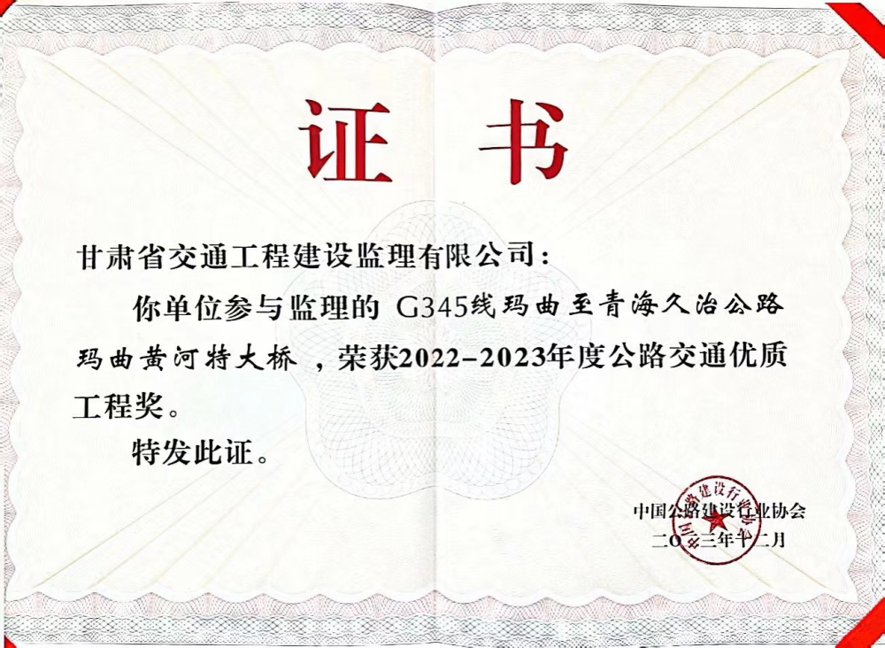 近日,中國公路建設行業(yè)協會于湖北武漢召開第五屆公路建設高質量大會暨2022-2023年度公路交通優(yōu)質工程獎表彰大會。省交通監(jiān)理公司“代建+監(jiān)理”的G345線瑪曲至青海久治公路瑪曲黃河特大橋榮獲公路交通優(yōu)質工程獎。此次獲獎系公司在兩徽、金阿高速公路之后第三次獲得全國公路交通優(yōu)質工程獎——李春獎。