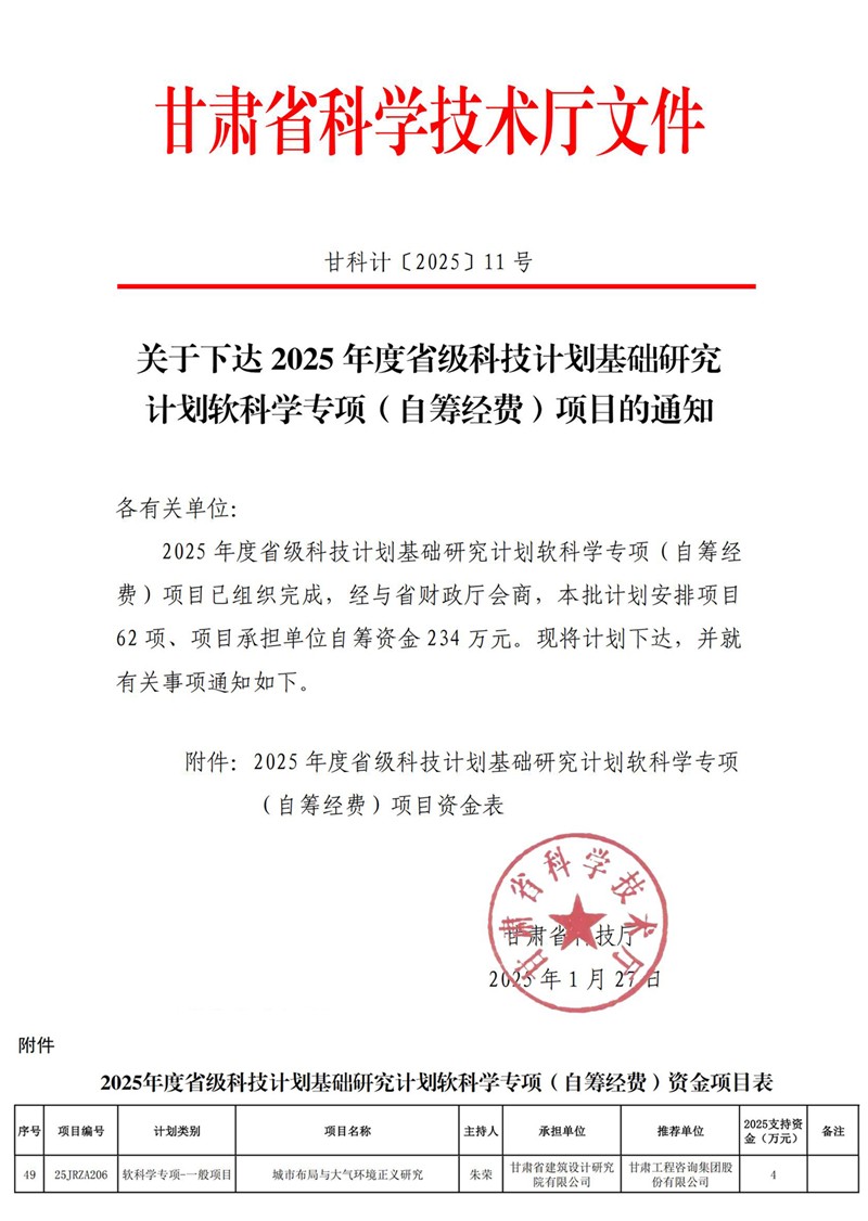 近日,甘肅省科技廳公布了2025年省級科技計劃基礎(chǔ)研究計劃軟科學專項(自籌經(jīng)費)項目立項結(jié)果,省建筑設(shè)計院申報的“城市布局與大氣環(huán)境正義研究”項目獲批立項。