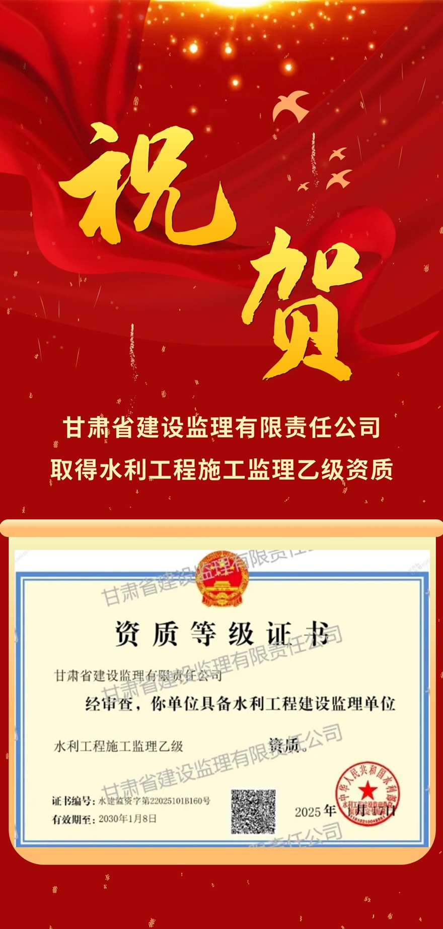 省建設監(jiān)理公司取得水利工程施工監(jiān)理乙級資質
