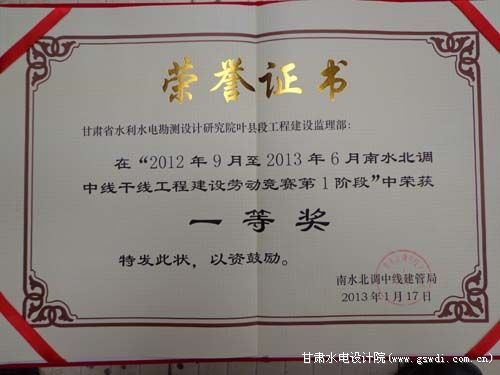 南水北調(diào)中線干線工程建設(shè)勞動(dòng)競(jìng)賽一等獎(jiǎng)