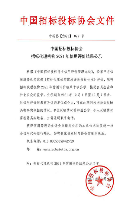 近日,在中國招標(biāo)投標(biāo)協(xié)會(huì)牽頭組織的2021年招標(biāo)代理機(jī)構(gòu)級信用評價(jià)認(rèn)證工作中,經(jīng)中招協(xié)委托的第三方信用服務(wù)機(jī)構(gòu)(國資委)商業(yè)信用中心及有關(guān)行業(yè)專家評審,招標(biāo)咨詢集團(tuán)子公司甘肅省招標(biāo)中心有限公司和甘肅金安建設(shè)工程項(xiàng)目管理有限公司獲得2021年招標(biāo)代理機(jī)構(gòu)AAA級信用評價(jià)最高等級認(rèn)證。